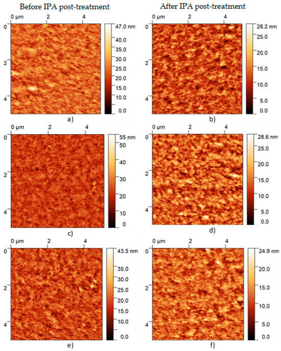AFM images of the (a,b) PEDOT:PSS-SA, (c,d) PEDOT:PSS-SB, and (e,f) PEDOT:PSS-SC composites films before and after the IPA post-treatment.
