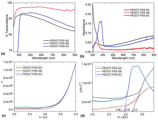 UV-vis spectroscopy was carried out to study the optical properties of the composite films; the transmittance and absorbance spectra are shown in Figure 8. Regarding transmittance, it is noted that the PEDOT:PSS-SB film has the highest transparency with a maximum value of 97% that is maintained throughout the entire wavelength (λ) range (Figure 8a). The PEDOT:PSS-SA and PEDOT:PSS-SC films, on the other hand, have a similar behavior, resembling that of pristine PEDOT:PSS [53]. PEDOT:PSS-SA has a maximum transparency of 93% and PEDOT:PSS-SC of 94% at λ < 440 nm and λ < 510 nm, respectively, while at a higher λ, the transmittance drops until reaching a minimum close to 80%. These results indicate that the PEDOT:PSS-SB film has the best performance in terms of the percentage of transmittance and its permanence throughout the visible range of the spectrum. The other two films also have high transmittance values in the visible spectrum; so, they could be useful in the manufacture of transparent electrodes for light emission devices, photovoltaic energy, touch screens, or electrochromic devices in the form of smart windows. They could also be used as a hole carrier layer (HTL), since their high transparency plays maximizes the photocurrent intensity in the photoactive layer [54]. Thus, due to the composite films’ transparency, they could be useful as HTL in organic electronics applications. PEDOT:PSS-salophen films are a viable alternative in this regard because of their higher maximum transmittance compared to that of pristine PEDOT:PSS; the maximum transmittance of this polymer is around 85% in the visible range. The presence of salophen favors transparency in the composite films, and the presence and type of substituent in the molecular structure of salophen has a significant effect on the transparency percentage of the composite films. The highest transmittance of 97% in SB is due to the presence of the oxygen and the -OMe electron-donating groups. The small size of the substituent that concentrates the electron-donating capacity is essential to allow the passage of almost constant radiation. On the other hand, the reduction and minimum transmittance of 80% is due to the lack of substituents in SA and the presence of the -NEt2 substituents in SC, which, despite having electron-donating capacity, are larger than -OMe.