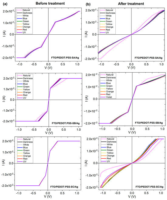 In order to study the electrical behavior of the composite films, glass/FTO/PEDOT:PSS-salophen/Ag monolayer devices were fabricated, where the FTO acts as the anode, while the Ag acts as the cathode. Figure 9a,b show the behavior of the three devices before and after the IPA treatment, respectively. The PEDOT:PSS-salophen films do not show ambipolar behavior; so, the type of electrodes in the devices is decisive. The devices were irradiated with light of different wavelengths, and, before the treatment, there is no significant effect of this radiation on the amount of electric current transported. After the IPA treatment, the natural lighting conditions modify the transport of electrical charges. The interactions among the PEDOT:PSS chains in the linear conformation of the quinoid form are stronger than those of the benzoid form before the treatment, and electrical charges can be transported more freely under natural light conditions and without the need for any type of excitation. On the contrary, under light or dark conditions, there is no change in the transported current because, in this case, the radiation is filtered based on its wavelength, and apparently, it is insufficient to increase the electrical charges circulating in the device. Although the maximum current of 0.02 A is the same in all cases, changes in the electrical behavior of the devices are observed after the IPA treatment.