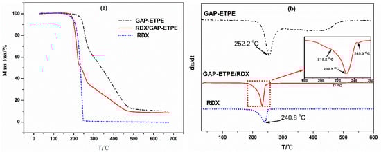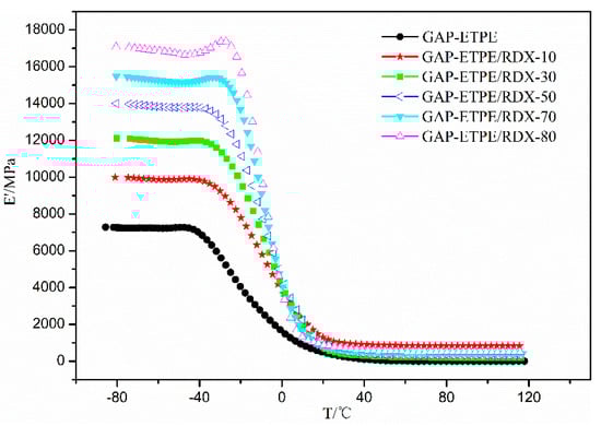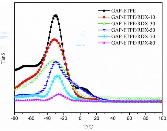 - DMA data showed the E’ value of GAP–ETPE/RDX composite increased from 7280 MPa to 17,000 MPa, and the Tg value was shifted to higher temperatures, ranging from −30.1 °C to −26.1 °C with the RDX percentages.