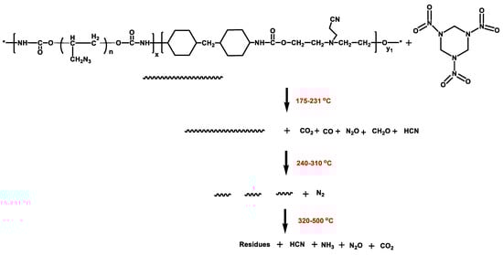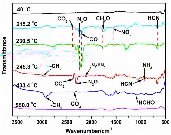 - The TG/FTIR results show that there are four stages during the GAP–ETPE/RDX thermal decomposition: the first two stages are attributed to RDX decomposition process (175–231 °C), which is divided into two stages, one is slow rate decomposition, and the other is self-catalyzed accelerated decomposition stage. The third stage is the azide group (240–310 °C), and the last stage corresponds to the polyether and polyurethane decomposition (320–500 °C).