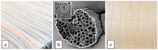 The technical (structural) sisal fiber typically comprises many sub-fibers with a diameter varying from 6 to 30 μm. It has a typical horseshoe cross-section (see Figure 1b) with a mean apparent diameter of 150–200 μm (monofilament), different from the usual synthetic fiber diameter (10–12 μm) of the “multi-filament” fiber used in traditional polymer matrix composites (PMCs).