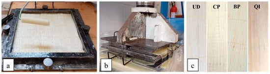 The biocomposite laminates have been manufactured using a unidirectional stitched fabric (see Figure 1c) preliminarily made in the laboratory. In detail, high-quality sisal-stitched fabrics have been implemented through a complex manual process of stretching the fibers, accurate alignment and stitching using an automatic sewing machine. Unidirectional sisal fabrics with a specific weight of about 220 g/m2 have been obtained.