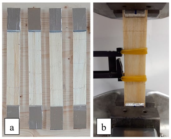 The fatigue tests on biocomposite specimens similar to those described above for the tensile tests have been carried out by using the same servo-hydraulic test machine used for static tests. In more detail, all the rectangular test specimens (see Figure 3a) have been cut by using a circular saw, and the surfaces near the short edges have been properly roughened with sandpaper to avoid possible sliding of the specimens with respect to the grips (see Figure 3b).