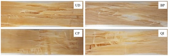 Typical images of specimens fractured by tensile test: UD = unidirectional specimen, BP = braided-ply specimen, CP = cross-ply specimen, QI = quasi-isostropic specimen.