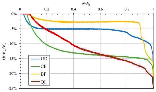 According to the classical literature on composites [36,37], the application of fatigue loading to a generic fiber-reinforced material leads to progressive damage, initially due to microcracking of the transversal laminae, followed by the fatigue damage of the interface and then of the fibers. To these damage phenomena, a progressive reduction in the laminate stiffness occurs. For this reason, for most synthetic fiber-reinforced composite materials, a reliable parameter to evaluate the current health under fatigue load is the so-called percentage damage parameter D, defined by the relative variation vof the Young’s modulus, i.e.,