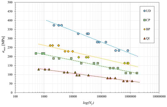 Figure 7 shows the classical fatigue curves for the four laminates considered, obtained by linear interpolating the experimental data reported in a classic S-N lifetime diagram.
