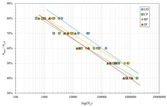 Figure 8 allows the evaluation of a given material’s fatigue performance concerning its static performance. It has been possible to observe how, in a low number of cycles (around 103 cycles and up to 104 cycles), CP laminates perform less than QI laminates, which in turn are less fulfilling than BP and UD. It has also been significant to observe that for the high number of cycles (around 106), the relative performance of BP (±7.5°) laminates exceeds that of unidirectional (0°). The interpolation of the experimental data for the four different laminates with Equation (3) gives the values of the coefficients a’ and b’ reported in Table 3.