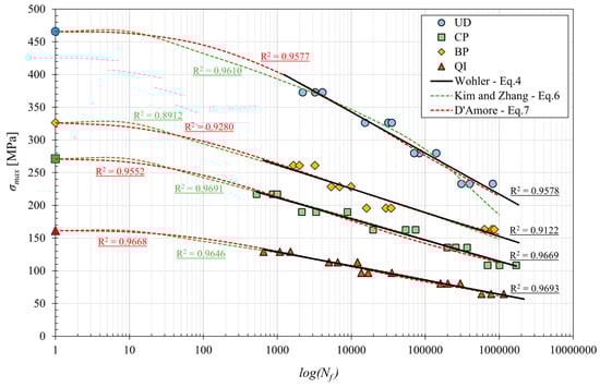 In order to compare the different models of the S-N curves reported, Figure 9 shows the relative curves obtained with the model proposed by Kim and Zhang with Equation (6) and that of D’Amore et al. with Equation (7) for each lay-up, superimposed on the classic model of Equation (4) and the respective experimental points.