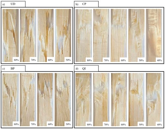 Concerning fatigue damage mechanisms, as mentioned above, it is possible to state that the experimental analysis has shown that these are not very different from the mechanisms observed in static loading conditions. For the four lay-ups considered, Figure 10 shows the images of the damaged specimens at the different percentage stress levels applied.