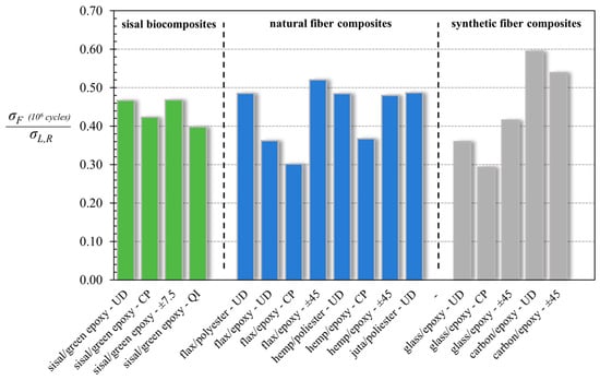 For a more immediate comparison of the fatigue performance of the composites considered in Table 5, in Figure 11, the relative values of the fatigue ratio (σF/σL,R) have also been reported through a bar graph.