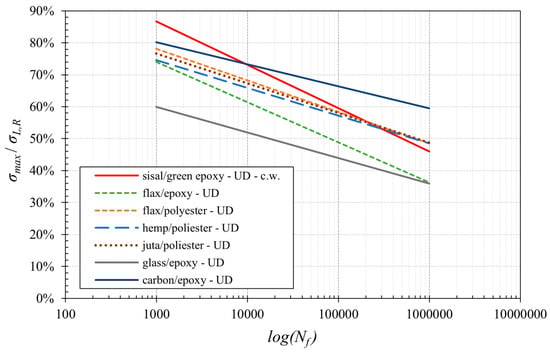 From Figure 12, it is clear how the fatigue behavior of the UD sisal fiber biocomposite at low numbers of cycles performs better than all the other considered composites, included carbon composites characterized by their high cost and environmental impact. This very interesting result, that is maintained up to about 104 fatigue cycles, is due to the sub-fibrillar structure of the sisal fiber (very similar to that of aramidic fibers) that leads to high failure energy and high fracture strength. Unfortunately, the relatively reduced stiffness of the analyzed biocomposites leads to the loss of such an advantage for very high fatigue cycles (more than about 3 105 fatigue cycles) with respect to the high-quality, more stiff natural fibers such as flax, etc.