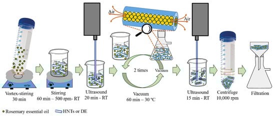 Firstly, to eliminate residual moisture due to the hydrophilic nature of these silica particles, HNTs and DE were dried at 150 °C for 3 h. Then the RO was encapsulated into HNTs or DE particles using a vacuum procedure according to previous reports [,] with slight modifications. Briefly, a solution of rosemary essential oil (RO) at 25 wt.% in ethanol was prepared and fully mixed by vortex-stirring for 30 min. Subsequently, each encapsulation material (HNTs or DE) was separately added to the RO solution at a weight ratio 1:0.2 and stirred at room temperature at 500 rpm for 60 min followed by ultrasonic homogenization in a Thermo Fisher Scientific Q125 (Waltham, MA, USA) at 10% of amplitude equipped with a tapered microtip CL-18 for 20 min in an ice bath, while an on/off pulse mode was chosen to prevent the overheating of the system. The resultant suspensions were subjected to vacuum for 1 h at 30 °C, and then cycled back to atmospheric pressure to replace the entrapped air in the particles lumens with the oil solution. Afterward, both mixtures were again homogenized by ultrasonication for 15 min. Finally, the remaining liquid was separated by centrifugation, washed with ethanol to remove the unencapsulated RO from the external HNTs and DE, and finally filtered to obtain a powder. In Figure 1 there is a schematic representation of the encapsulation process. Before processing with PLA matrix, the loaded HNTs and DE particles were dried in an air-circulating oven at 80 °C for 12 h [].
