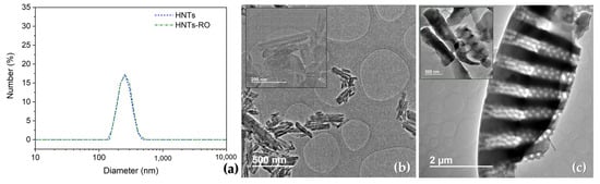 The hydrodynamic sizes of the pristine HNTs and HNTs encapsulating RO were determined by DLS, which showed a monomodal size distribution showing no significant differences between them with well-defined peaks between 155 nm to 410 nm (Figure 2a) centered at 254 nm in the case of HNTs and at 257 nm for RO loaded HNTs. However, the DLS technique is designed to calculate the hydrodynamic diameter of spherical nanoparticles, and thus, to corroborate the tubular shape as well as the actual dimensions of HNTs, TEM observations were also conducted. Additionally, as DE are microparticles, it was not possible to measure the particles through DLS and they were directly observed by TEM.