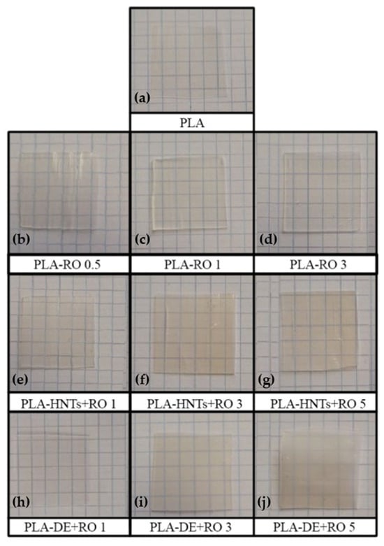 Visual appearance of the obtained films. (a) PLA; (b) PLA-RO 0.5; (c) PLA-RO 1; (d) PLA-RO 3; (e) PLA-HNTs + RO 1; (f) PLA-HNTs + RO 3; (g) PLA-HNTs + RO 5; (h) PLA-DE + RO 1; (i) PLA-DE + RO 3; and (j) PLA-DE + RO 5.