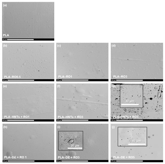 SEM images of the cryo-fracture section of the obtained films. (a) PLA; (b) PLA-RO 0.5; (c) PLA-RO 1; (d) PLA-RO 3; (e) PLA-HNTs + RO 1; (f) PLA-HNTs + RO 3; (g) PLA-HNTs + RO 5; (h) PLA-DE + RO 1; (i) PLA-DE + RO 3; and (j) PLA-DE + RO 5.