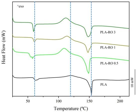 DSC first heating scan of the neat PLA and PLA with direct addition of RO films.