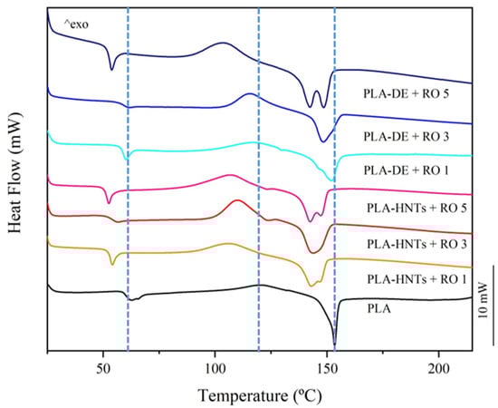 DSC first heating scan of the neat PLA, PLA-HNTs + RO, and PLA-DE + RO films.