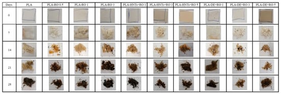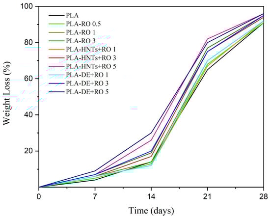 After 21 days, the disintegration rate of all the films was over 50%. It is worthy to note that the film with the highest content of non-encapsulated essential oil reached a weight loss similar to those just mentioned with the highest DE or HNTs content, thus evidencing that the essential oil also favors faster disintegradability due to the increased polymer chain mobility as a consequence of the already mentioned plasticizing effect of RO for the PLA matrix. Although more days were necessary in this case, it was due to the lower presence of RO in the PLA-RO 3 than in PLA-HUNTS + RO 5 and PLA-DE + RO 5. The increment of free volume, with more space between polymer chains that plasticization supposes, leads to an easier diffusion of water molecules and hence facilitates the hydrolysis activity to shorten the polymer chain and make the enzymatic disintegration promotion of the PLA matrix.
