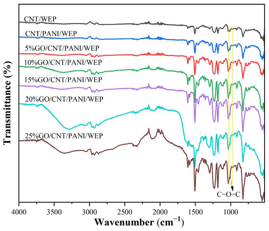 Figure 3 shows the FT-IR spectra of CNT/WEP composite coating, CNT/PANI/WEP composite coating, and GO/CNT/PANI/WEP composite coatings with different content of GO. The intensity of the adsorption peaks of C-O-C at about 1011 cm−1 increased as the content of GO increased, demonstrating that the change in content of GO could reflect in composite coatings and consequently affect the performance of composite coatings differently.