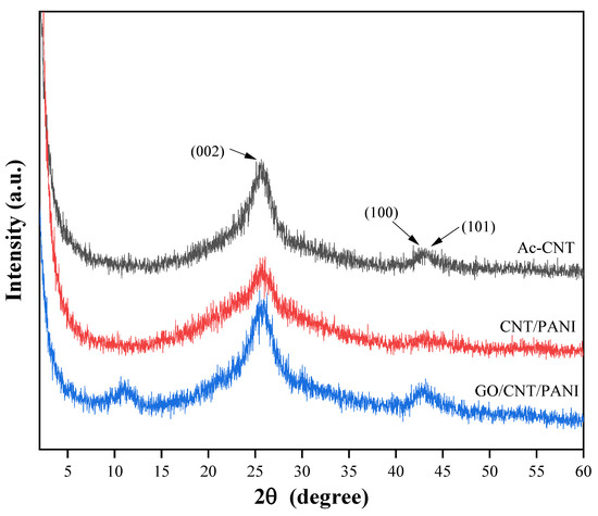 XRD patterns of Ac-CNT, CNT/PANI, and GO/CNT/PANI nanocomposites.