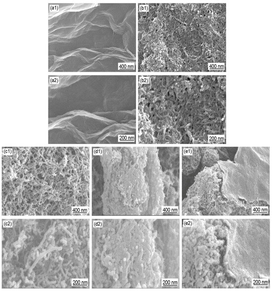 SEM images of (a1,a2) GO, (b1,b2) Ac-CNT, (c1,c2,d1,d2) CNT/PANI, and (e1,e2) GO/CNT/PANI.