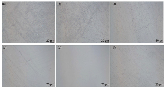 Figure 8 shows the effect of GO on the dispersion of GO/CNT/PANI composite filler in WEP composite coatings. For comparison, Figure 8a,b shows the morphology of CNT/WEP and CNT/PANI/WEP composite coatings. The amounts of GO in the filler shown in Figure 8c–f correspond to 5%, 15%, 20%, and 25% of CNT and AN, respectively. It can be observed that there are numerous filamentary agglomerations of CNT in the coating without or at low levels of GO content (Figure 8a–c). The agglomeration phenomenon decreases as the GO content increases (Figure 8d), and the GO/CNT/PANI composite filler exhibited the most uniform distribution within the coating at a GO content of 20% (Figure 8e). However, continuing to increase the amount of GO in the filler results in the accumulation of GO flakes, which in turn leads to inadequate dispersion of the GO/CNT/PANI composite filler in the coating, and spotted aggregation appeared in the composite coating, as shown in Figure 8f. The results indicate that the distribution of filler in water aligns with the distribution of filler in the aqueous coating. The nanofiller in the WEP composite coating is more uniform when the mass fraction of GO is 20% of CNT and AN.