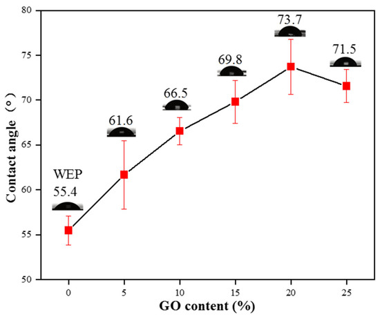 Hydrophobicity can also enhance corrosion resistance due to decreased water/surface interactions [41]. Figure 10 displays the level of hydrophobicity present in WEP and GO/CNT/PANI/WEP at different GO concentrations. From the graph, it is evident that the coating’s hydrophobicity increases gradually with the percentage of GO in the GO/CNT/PANI composite filler, and the contact angle of coatings peaks at 73.7° when the filler contains 20% GO. Combining the findings from Figure 7 and Figure 8, the findings illustrate that the filler is optimally dispersed within the coating, which increases its ability to hydrophobicity and is the primary reason for the maximum contact angle of the coating. Continuing to escalate the amount of GO can lead to poor dispersion of the composite filler in the coating, resulting in a decrease in the hydrophobicity of the coating, which negatively affects the anticorrosive performance of the coating.