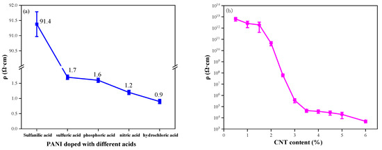 Figure 11a compares the resistivity of PANI samples prepared with various doping acids. PANI prepared with inorganic acid doping exhibits lower resistivity than that prepared with organic acid doping. Among inorganic acid-doped samples, PANI prepared with hydrochloric acid doping displays the lowest resistivity at only 0.9 Ω·cm. Therefore, choosing hydrochloric acid-doped PANI for nanocomposite preparation with carbon materials is more favorable for enhancing the conductivity of composite coatings.