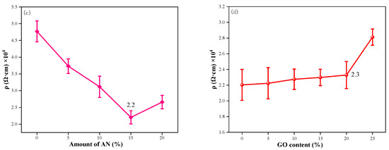 The resistance of the GO/CNT/PANI/WEP composite coating loaded with 3.5% GO/CNT/PANI of different GO components is shown in Figure 11d. It is proven that adding an appropriate amount of GO to the filler has no adverse effect on the resistivity of the coating. According to the diagram, adding a paucity of GO to the composite coating does not significantly alter its resistivity. However, the resistivity of the coating is increased with an excess of GO added. Combined with the analysis of Figure 7 and Figure 8, it can be concluded that the dispersion of the filler in the water and coating and the corrosion resistance of the coating were improved by introducing GO into the composite coating. GO has excellent anticorrosive properties, but it tends to agglomerate and has high resistivity. Wrapping PANI on GO could compensate for its high resistivity shortcoming of GO. Therefore, the addition of GO improves the corrosion resistance of the composite coating without negatively affecting the electrical conductivity of the composite coating. However, PANI is not uniformly distributed on GO when GO has overdosed. The barrier effect of CNT on GO lamellae also becomes worse, which leads to a decrease in the dispersion and conductivity of the composite filler, as well as an increase in the resistivity of the composite coating.