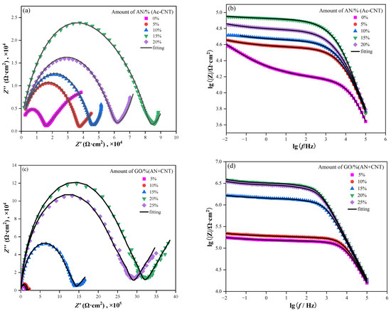 In the Nyquist plots of the electrochemical impedance spectroscopy (EIS), a larger capacitive loop represented the better anticorrosion performance of the coatings [46]. It can be seen from Figure 12a that all the semicircle diameters of capacitive loops of CNT/PANI/WEP coatings are greater than that of CNT/WEP coating, and their semicircle diameters of capacitive loops increase as the content of PANI in the filler increases until the mass ratio of AN to CNT is 15%, of which the semicircle diameters of capacitive loops are the largest. The semicircle diameters of capacitive loops become smaller as continuing to increase the content of PANI. The decrease in resistance may be related to the agglomeration of PANI. Add GO while keeping the ratio of AN to the CNT unchanged, and the semicircle diameters of capacitive loops of GO/CNT/PANI/WEP composite coating become greater again than that of CNT/PANI/WEP coating and increase with the increase in the proportion of GO in the filler until the addition amount of GO is 20% of CNT and AN, of which the semicircle diameters of capacitive loops are the largest, as shown in Figure 12c, indicating that the barrier properties of the GO/CNT/PANI/WEP composite coating were better than that of the CNT/PANI/WEP composite coating, and the best when the addition amount of GO is 20% of CNT and AN.