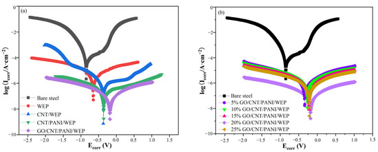 (a,b) Potentiodynamic polarization curves of the coated steel immersion in a 3.5 wt% NaCl solution.