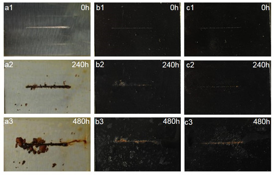 Optical photographs of (a1–a3) neat WEP coating and composite coating of (b1–b3) 3.5 wt% CNT/PANI/WEP and (c1–c3) 3.5 wt% GO/CNT/PANI/WEP before and after 240 h and 480 h of salt spray test.