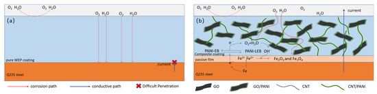 Schematic illustration of (a) neat WEP coating and (b) GO/CNT/PANI/WEP composite coating during the corrosion process.