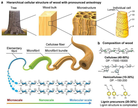 - Yang, X.; Berglund, L.A.; Yang, X.; Berglund, A. Structural and Ecofriendly Holocellulose Materials from Wood: Microscale Fibers and Nanoscale Fibrils. Adv. Mater. 2021, 33, 2001118. [Google Scholar] [CrossRef] [PubMed]