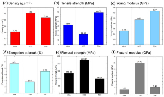 | Sample | Density cm−3) | Tensile Strength (MPa) | Young’s Modulus (GPa) | Elongation at Breaking (%) | Flexural Strength (MPa) | Flexural Modulus (GPa) |