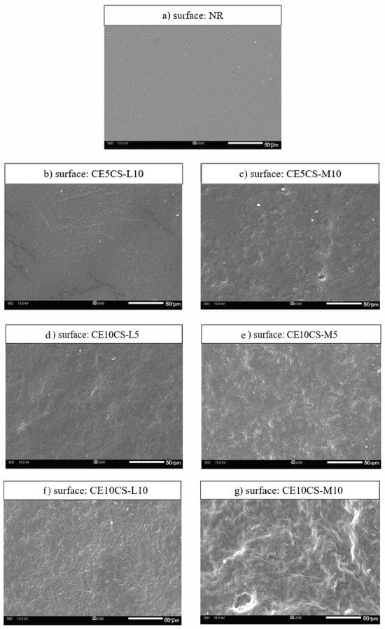 Figure 1 shows SEM images of the surfaces of NR and CE/CS/NR films prepared via the latex aqueous microdispersion method [13,28,29]. The thickness of the NR and NR composite films was around 0.3 mm. According to surface SEM images, the neat NR film had a smooth outer surface with a dense structure (Figure 1a), while an increase in roughness was observed on the surfaces of CE/CS/NR films, related to the loading content of CE and CS (Figure 1b–g). The filler, CE, thoroughly dispersed and integrated in the NR matrix and acted as a reinforced filler. The degree of surface roughness increased with increasing contents of CE and CS-M/CS-L. The surface of the films containing CS with medium MW (CE/CS-M/NR) were relatively rougher than those containing CS with low MW (CE/CS-L/NR). The surface roughness could be caused by the differences in polarity and density of NR, CS, and CE [24]. The films of CE/CS-M/NR had rougher surfaces than those of CE/CS-L/NR, as the longer chains of chitosan could increase interactions among neighboring chains.