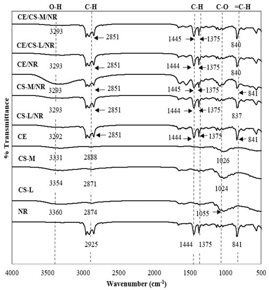 FTIR spectra of NR, CS-L, CS-M, CE, and NR composite films.