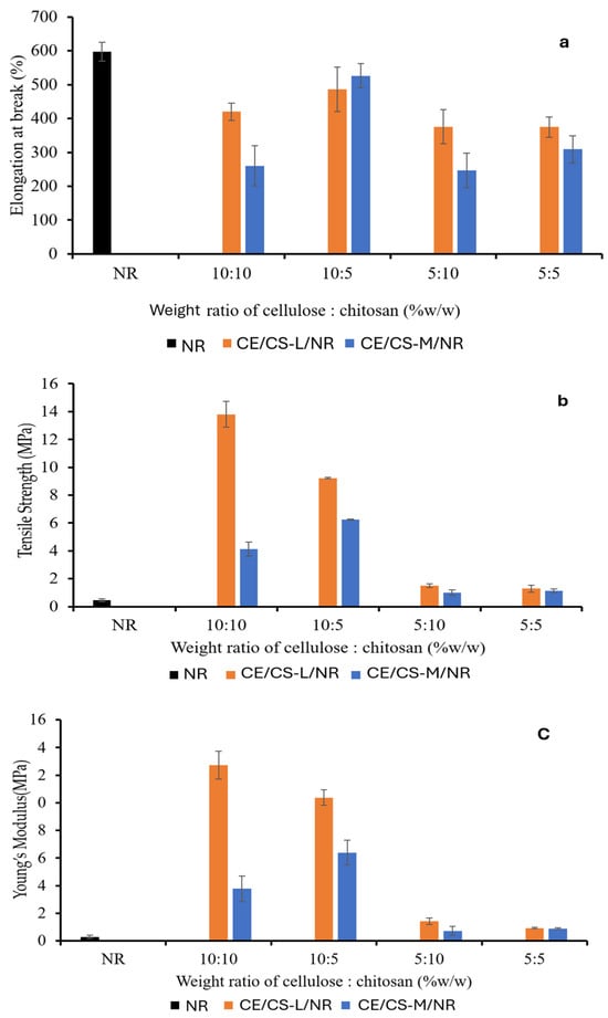The CE/CS/NR composite films were less extendable compared with pure NR due to the reduced elongation. In Figure 4a, with increasing chitosan content, the elongation values decreased. When the percentage of chitosan increases, the chain flexibility of system was more limited [38], and the molecular mobility of NR was reduced [39], resulting in the decrease in elongation values. CE has high tensile strength due to firm hydrogen bonds between the individual chains in CE microfibrils. From previous studies, with the integration of CE in the NR matrix, significant improvements in the Young’s modulus and tensile strength of the composites were achieved [40].