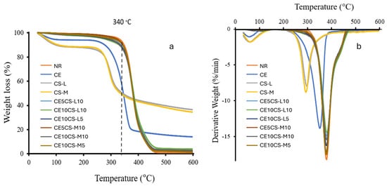 The thermal degradation analysis (TGA) was determined, as shown in Figure 5a. The TGA curves show the % weight loss of CE, NR, CS, and CE/CS/NR composite films at various temperatures. The weight loss detected below 200 °C was from the vaporization of water from CE and CS, resulting in a weight loss of approximately 5–12% of the initial weight. The CS, CE, and NR decomposed first, with an initial decomposition of 250, 260, and 340 °C, respectively [25]. The composite films of CE/CS/NR showed trend lines of the polymer decomposition, similar to that of NR. The maximum rate of weight loss in the composite films occurs at around 250–450 °C in accordance with the decomposition of CS, CE, and NR, respectively. At temperatures above 450 °C, the remaining dry weights of the decomposition products, such as char, non-volatile residues with high carbon content, were determined. The char yields of CE10CS-L10, CE10CS-M10, CE10CS-L5, CE10CS-M5, CE5CS-L10, and CE5CS-M10 were 7.65%, 4.81, 5.13%, 1.57%, 3.77%, and 1.10%, respectively. The char yield was higher when the CE and CS content increased. CE and CS are composed of glucose units joined via β-1,4 glycosidic linkage, in which glucose consists of six carbon atoms bonded together as a chain with additional atoms of oxygen and hydrogen. In this study, the crystallinity value of CS-L was 76%, which was higher than that of CS-M (63%). It was demonstrated that the char yields of CS-L and CE-CS-L were slightly higher than that of CS-M and CE-CS-M. Compared to the composite films incorporated with CS-M, it was shown that the composite films incorporated with CS-L have lower tensile elongation but higher tensile strength and higher modulus, as well as higher heat resistance and lower weight loss. Previously, it was shown that the addition of chitosan in starch-based biodegradable composite films decreased elongation at break but improved tensile strength and tensile modulus as well as increased the thermal stability of the composite films [41]. The CE/CS/NR composite films presented increased thermal stability when compared with CE and CS. With good distribution and dispersion of CE and CS in the NR matrix, the interfacial adhesion between the fibers and the NR matrix could be enhanced, resulting in more interaction between CE, CS, and NR and improved thermal stability. Similar TGA patterns of NR, CE, and their composites have previously been reported on the composite films of NR reinforced with cellulose using a latex aqueous microdispersion process [13,28,29].