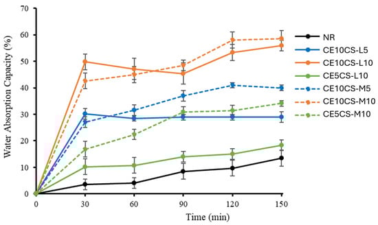 The measurement of water absorption capacities (WAC) of NR and CE/CS/NR films was carried out with respect to the immersion time in the range of 0–150 min (Figure 7). The reinforcement of CE and CS at 5–10% wt. in the NR matrix enhanced the rate of water absorption. During the 30 min of immersion, water was rapidly absorbed into CE10CS-L10, CE10CS-M10, CE10CS-L5, CE10CS-M5, CE5CS-L10, and CE5CS-M10 films, reaching equilibrium condition at around 150 min. The pure NR film slowly absorbed water, and the WAC at 150 min was only 13.4% due to the hydrophobic nature of NR, whereas the films CE10CS-L10 and CE10CS-M10 had considerably higher WAC at around 56 and 58%, respectively. The CE10CS-M10 had more WAC than CE10CS-L10 because CS-M could form a relatively higher number of hydroxyl groups as compared to CS-L [34]. In a similar way, the film of CE5CS-M10 has higher WAC (27%) compared to CE5CS-L10 (14%).