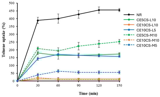 Toluene uptake with time of NR and CE/CS/NR composite films.