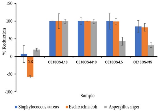 E. coli (gram negative bacteria) and S. aureus (gram positive bacteria) were used for the antibacterial tests, and A. niger was used for the antifungal test. The reinforcement of CE and CS at 5–10% wt. in the NR matrix significantly enhanced antimicrobial ability of the composite films. Generally, CS can effectively control the growth and reproduction of hazardous bacteria and exhibits antibacterial activities on both Gram-positive and Gram-negative bacteria. The antibacterial activity of CS was found to be greater on S. aureus than on E. coli [52]. The results, as shown in Figure 9, revealed the antimicrobial effect of the integration of CS of MW 30,000 (CS-L) and 500,000 (CS-M) into the composite films. The maximum antimicrobial activity against S. aureus, E. coli, and A. niger at about 100% was obtained from the composite films of CE10CS-L10 and CE10CS-M10. In this study, it was demonstrated that, to some extent, CS-L could inhibit microorganisms more effectively than CS-M. In addition, the percentage of reduction increased with increasing CS-L and CS-M content from 5 to 10% wt. The antimicrobial ability of composite films composed with CS should depend on their cationic nature and molecular size. Previously, from the study of the effect of the antimicrobial activities of CS against E. coli, it was reported that CS samples with MWs from 5.5 × 104 to 15.5 × 104 Da had antimicrobial activities at concentrations higher than 200 ppm, and the antibacterial activity of low MW chitosan was higher than that of the high MW chitosan [53]. The presence of CS in the biocomposite of CS and NR also resulted in enhanced antibacterial activity against S. aureus [38]. CS also has a strong antifungal effect, and it has been used to directly inhibit the growth of several fungal pathogens on crop plants [54]. A slight reduction effect was observed in the system incubated with S. aureus and A. niger on NR film, while the number of E. coli increased. The negative percentage reduction for NR indicated an increased number of E. coli in the system incubated with the NR film. Hence, the NR sample did not have antibacterial effects against E. coli.