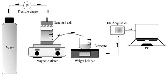 A water flux experiment was performed utilizing a stirred dead-end cell, as illustrated in Figure 1. The fabricated membranes were trimmed to the necessary dimensions to be applied in the stirred dead-end cell. The feed solution filled the cell, and the entire experiment was conducted at a constant temperature of 28 °C. Nitrogen gas, kept at a specified pressure (2 bar), was delivered into the cell to provide the necessary pressure for the pure water to pass through the membrane’s pores. The weight of the permeate collected in the experiments was used to evaluate the permeated pure water. The quantity of water that permeated the fabricated membrane was meticulously recorded by a data acquisition system during the experiment. The following equations were employed to calculate both the volumetric flux () and the permeability.