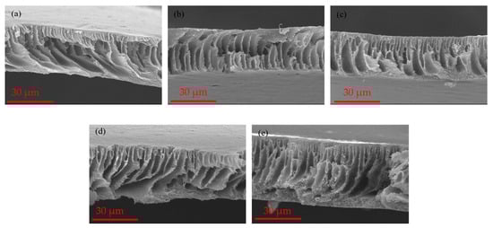 Cross-section SEM images of the fabricated membranes: (a) PSF-nAC0; (b) PSF-nAC2; (c) PSF-nAC4; (d) PSF-nAC6; (e) PSF-nAC8.