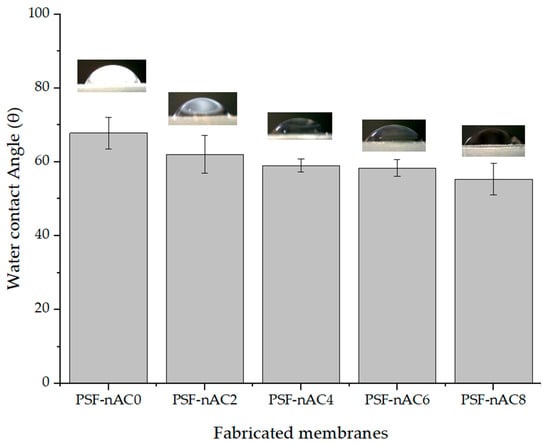 Hydrophilicity is one of the most crucial factors of a membrane when investigating membrane permeability and understanding the filtration mechanism. The water contact angle of the membranes helps one to analyze the surface hydrophilicity of the fabricated membranes. A hydrophilic membrane generally indicates a lower contact angle, with a value less than 90°. The contact angles of the pristine membrane and composite membranes are presented in Figure 4. As shown in Figure 4, the pristine PSF membrane (0 wt.% nano-activated carbon powder) is found to be the most hydrophobic, whilst the most hydrophilic surface was obtained at a concentration of activated carbon powder of 8 wt.%.