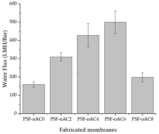 The water flux of the PSF composite membrane achieved the highest value of 500 LMH/Bar with an activated carbon powder concentration of 6 wt.%. The enhanced permeability through the membrane can be attributed to the surface hydrophilicity characteristics of the membranes (as shown in Figure 5), resulting from the incorporation of nAc powder. This finding is in agreement with previous research which stated that the increase in permeability is due to the decrease in the water contact angle [43], since the increased hydrophilicity of the surface is expected to enhance water molecule absorption, resulting in improved membrane permeability. However, when increasing the nAC concentration from 6 wt.% to 8 wt.%, powder aggregation may occur due to the higher amount of powder in the doping solution. Additionally, elevating the nAC concentration in the doping solution led to an increase in the solution’s viscosity, which, in turn, may cause delayed demixing during the wet phase inversion process and result in the formation of powder clots on the membrane’s surface. Optimizing the concentration of activated carbon may lead to improved flux in polymer membranes. Higher concentrations of activated carbon can lead to increased accumulation, weak dispersion, and the formation of disconnected channels, resulting in reduced water flow [44].