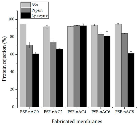 The protein rejection percentages using the pristine membrane and the composite membrane employing a BSA, pepsin, and lysozyme solution are displayed in Figure 6. In Figure 6, the pristine membrane, not including nAC, exhibits rejection percentages of 94.9% for BSA, 70.8% for pepsin, and 60.9% for lysozyme. The enhanced separation of BSA and the reduced separation of lysozyme can be attributed to their distinct molecular sizes. Moreover, the inclusion of nAC significantly influences the membrane’s rejection performance. As the nAC concentration increased to 6 wt.%, protein separation markedly decreased to 82.9% for pepsin and 81.3% for lysozyme. However, the elevated protein rejection observed in the composite membrane containing 4 wt.% nAC can be ascribed to the reduction in pore size. Protein rejection and permeation ability are primarily influenced by the hydrophobic and hydrophilic interactions of the membrane, rather than its pore size. Consequently, the hydrophilic surface of the membrane impedes the adhesion of hydrophobic protein molecules to the high nAC concentration on the composite membrane surface. Consequently, the composite membrane containing 4 wt.% nAC demonstrated superior rejection performance when compared to both the pristine membrane and the membrane with 6 wt.% nAC. This significant variation in protein rejection can be attributed to morphological changes occurring during the phase inversion method.
