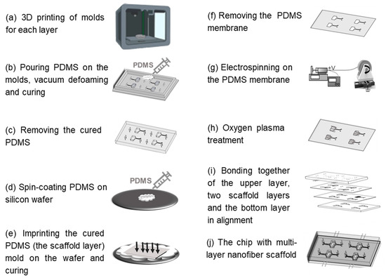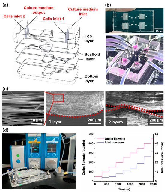 The HOC preparation process is shown in Figure 1, and the molds of each layer were prepared by a light-curing 3D printer (S240, BMF PRECISION TECH, Shenzhen, China) with a printing accuracy of 10 μm. The top and bottom layers of the chip can be obtained directly by pouring PDMS into the molds, heating and curing it, and then demolding it. The preparation of the PCL nanofiber scaffold layers requires the following: 1. Pouring PDMS into the 3D-printed scaffold layer mold for curing and demolding to obtain the scaffold layer mold (PDMS); 2. Spin-coating a layer of PDMS onto the wafer, inverting the scaffold layer mold (PDMS) on the wafer, and obtaining the scaffold layer’s PDMS membrane by heating and curing; 3. Fixing the PDMS film on a roller for electrostatic spinning and then performing electrospinning. Finally, the surfaces of the top layer, the two nanofiber scaffold layers, and the bottom layer were sequentially treated with oxygen plasma (PLUTO-T, BasalMedia, Shanghai, China) at 100 W power for 90 s, and then the layers of the chip were bonded layer by layer within 1 min. All steps pertaining to the curing of PDMS in the preparation process were vacuumed under a negative pressure of 0.5 MPa for 20 min before curing to remove air bubbles, and then heated at 60 °C for 30 min to complete the curing process.