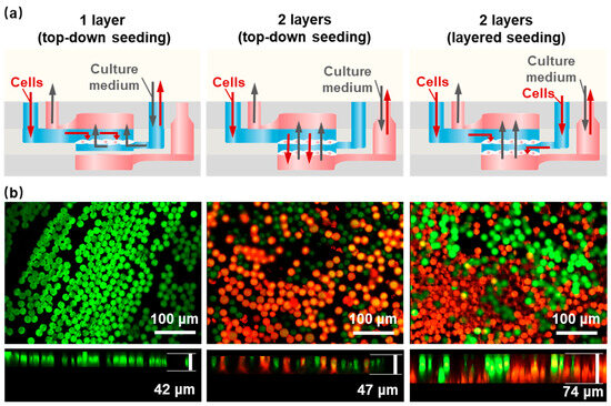 Different cell seeding methods within the HOC. (a) A schematic of different seeding methods. (b) PS microsphere fluorescence images of a 1-layer AF and a 2-layer AF with top-down and layered seeding methods. Green: the green fluorescent microspheres; Red: the red fluorescent microspheres.